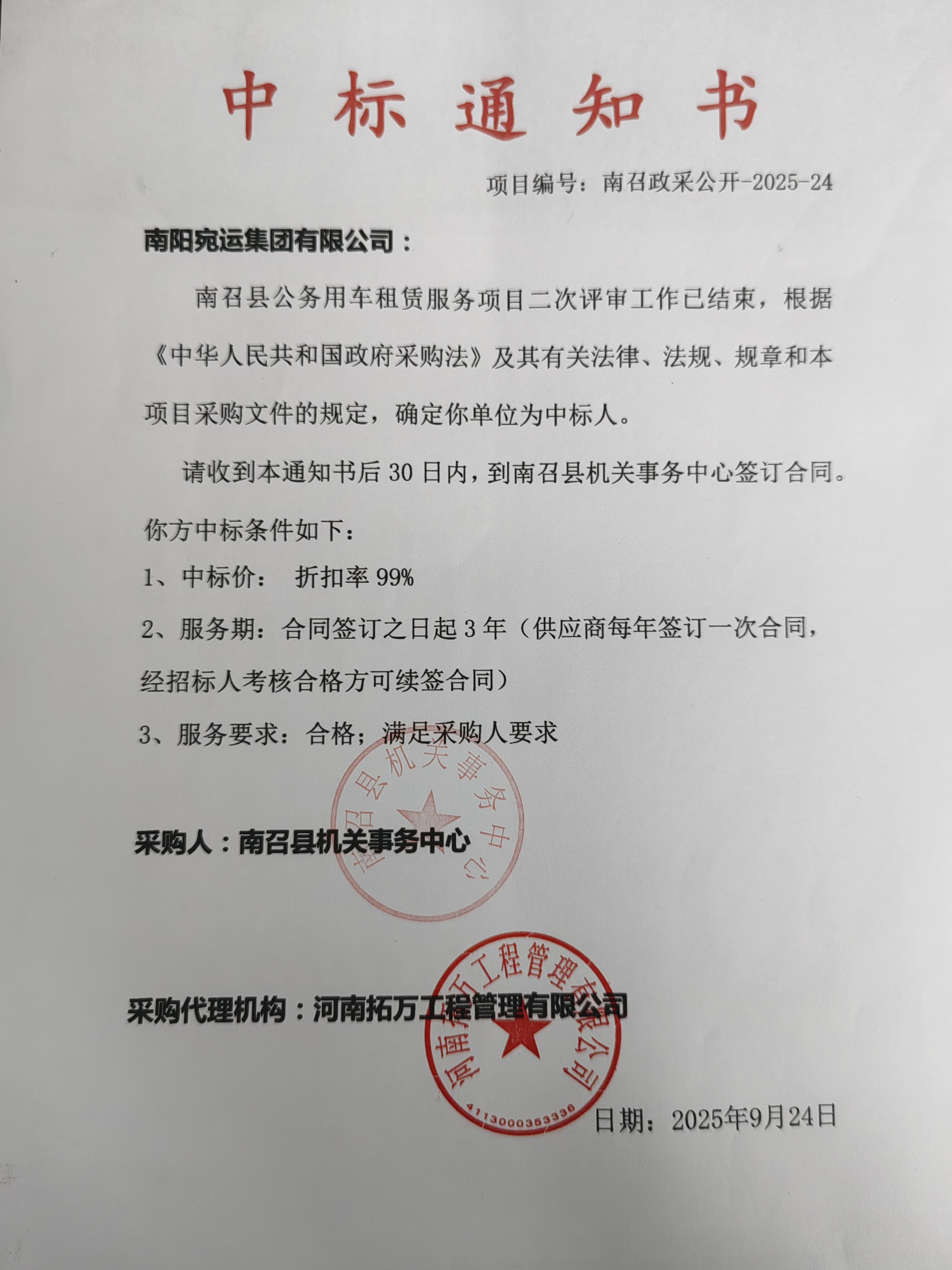 南召县机关事务中心南召县公务用车租赁服务项目-合同公告